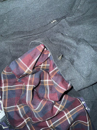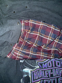 An up-cycled from a vintage Harley Davidson T-shirt re-imagined with contrast modular plaid sleeves.