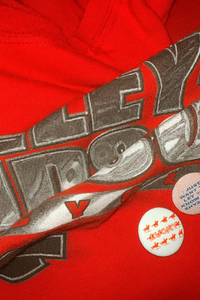 An up-cycled from a vintage Harley Davidson T-shirt re-imagined with contrast modular plaid sleeves.